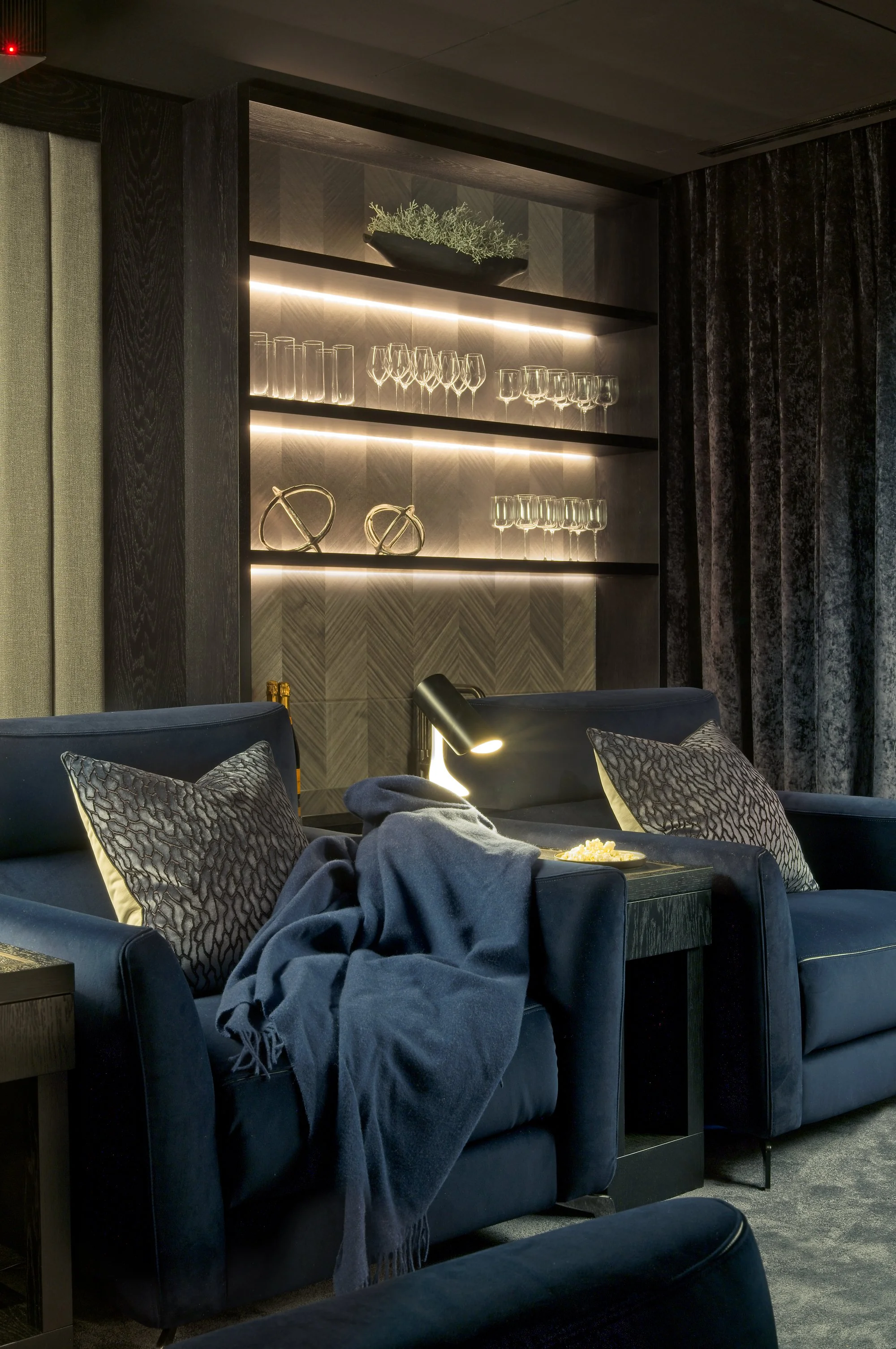 Designing a cinema room requires clarity, experience and close attention to detail. Our role is to manage the process from initial concept through to final installation and styling, ensuring every element works in harmony. The result is a space that feels effortless to use, beautifully resolved, and designed to stand the test of time.